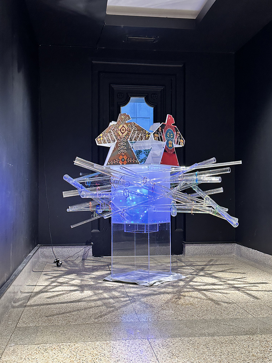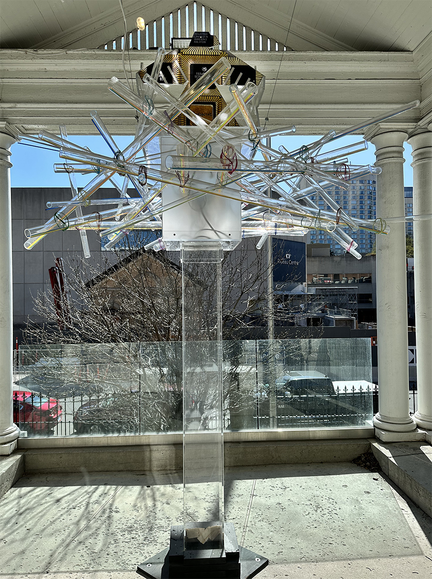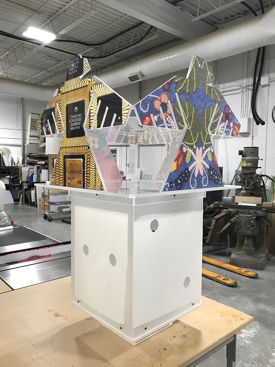 Constructed entirely out of contemporary material (acrylic plexiglass), Zasaan incorporates clear and frosted acrylic sheets, acrylic tubes, as well as internal treatments with phosphorescent material. Each plexiglass bneswag consists of two acrylic cut-outs and high resolution images of Ace’s signature electronic component floral motifs referencing Great Lakes floral beadwork printed on Duratran backlit film and sandwiched in between. When natural and artificial light passes through these diverse materials, Zasaan continually transforms itself through the natural cycle from daylight to night.