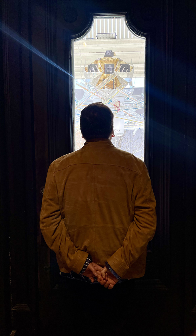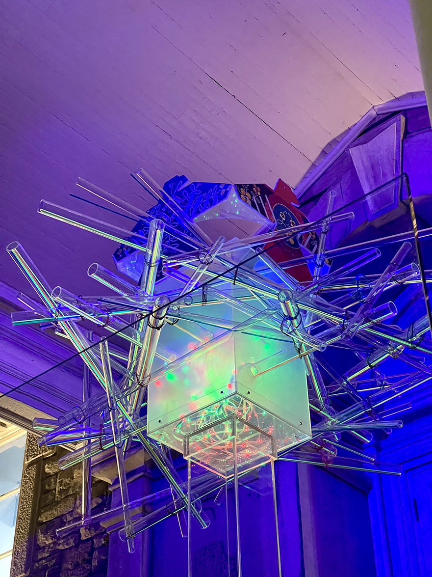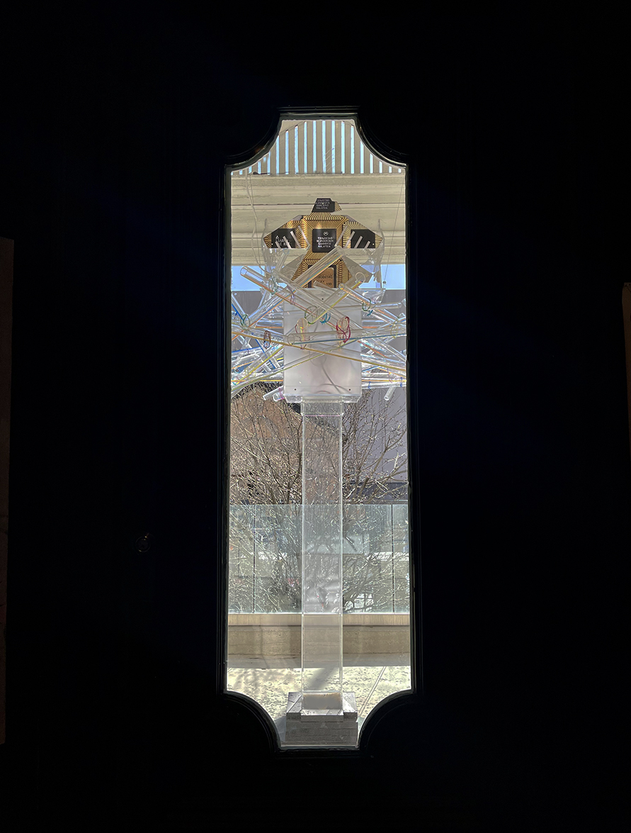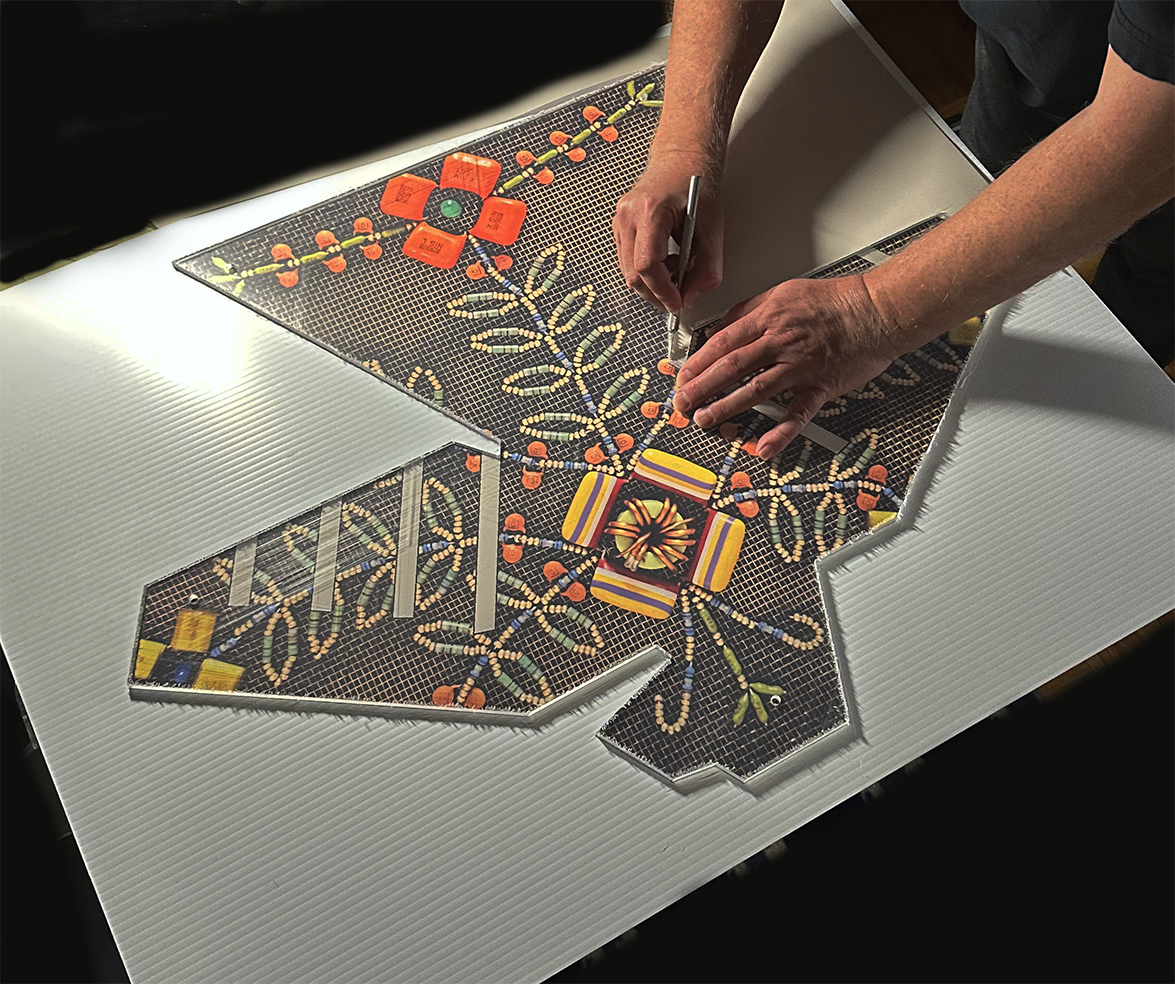 Constructed entirely out of contemporary material (acrylic plexiglass), Zasaan incorporates clear and frosted acrylic sheets, acrylic tubes, as well as internal treatments with phosphorescent material. Each plexiglass bneswag consists of two acrylic cut-outs and high resolution images of Ace’s signature electronic component floral motifs referencing Great Lakes floral beadwork printed on Duratran backlit film and sandwiched in between. When natural and artificial light passes through these diverse materials, Zasaan continually transforms itself through the natural cycle from daylight to night.