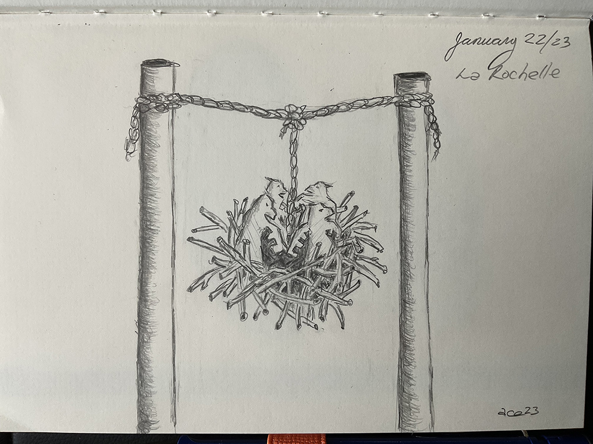 Early preliminary sketch for Zasaan (Nest). La Rochelle, France. January 2023.