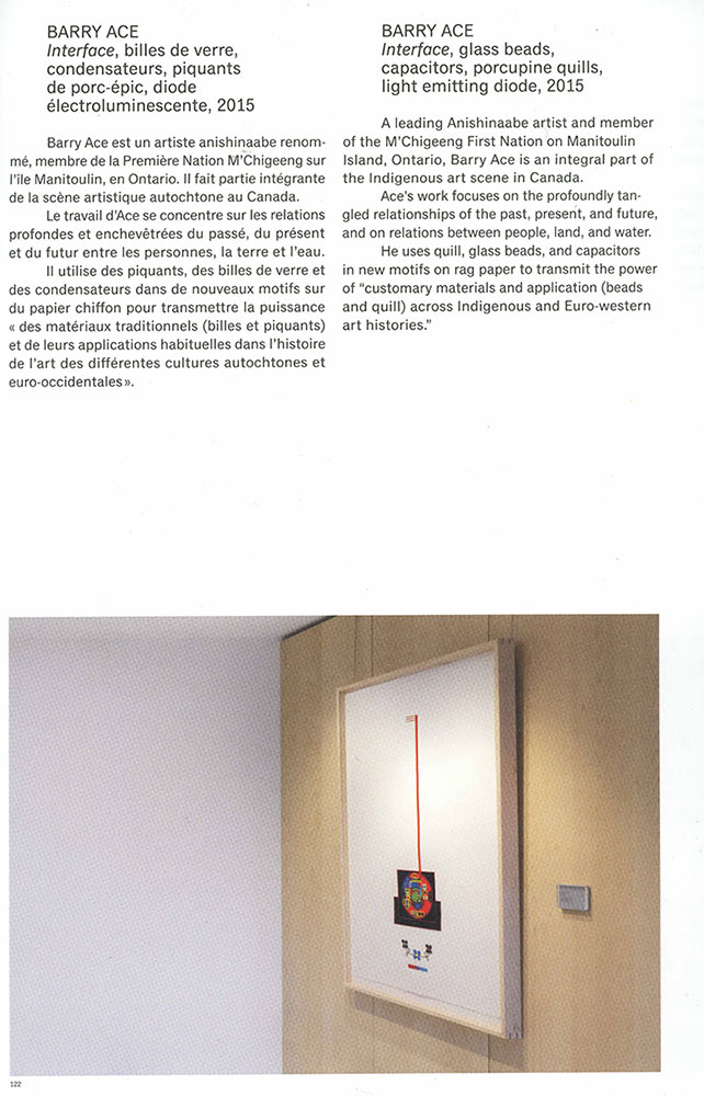 Binesi (Thunderbird) Bandolier Bag was sent to New York City where it is installed in the offices of the Consulate General of Canada, while Interface was sent to Paris, France and installed in the new Embassy of Canada located on 130 rue du Faubourg Saint-Honore, Paris, France. The official opening of the new Embassy and Canadian Cultural Centre was held on May 17, 2018 and Global Affairs Canada marked the occasion with a deluxe publication documenting the history and renovation of the historic building and highlighted the works of art and artists installed throughout the Embassy. Her Excellency Isabelle Hudon, Ambassador of Canada to France writes in her introduction:
