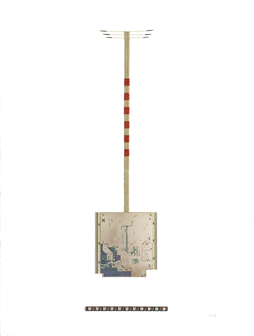 In Ace’s new Automata paperwork series, he explores this conceptual interrelatedness between mythology and the concept of the automaton through a set of cultural specific iconography and abstracted animal forms that can be located in the schematics printed on vintage electronic circuit-boards. Ace reworks these motifs and transforms them into a contemporary technological read on Anishinaabe cultural and mythological representations. Ace further coalesces and animates the concept of power into these paperworks through his integration of electronic circuit-boards and manidoominens (glass beads). This melding of two disparate materials and concepts are unique to Ace’s work and can be further articulated through the creation of a new portemanteau – mythotronic (mythological and electronic). Where mythotronic speaks to the convergence of the historical and contemporary by (re)presenting these abstracted Anishinaabe animate figurative representations as contemporary signs, coded visual language and demonstrative evidence of the presence of automata-like Anishinaabe symbology encoded into our technological age.