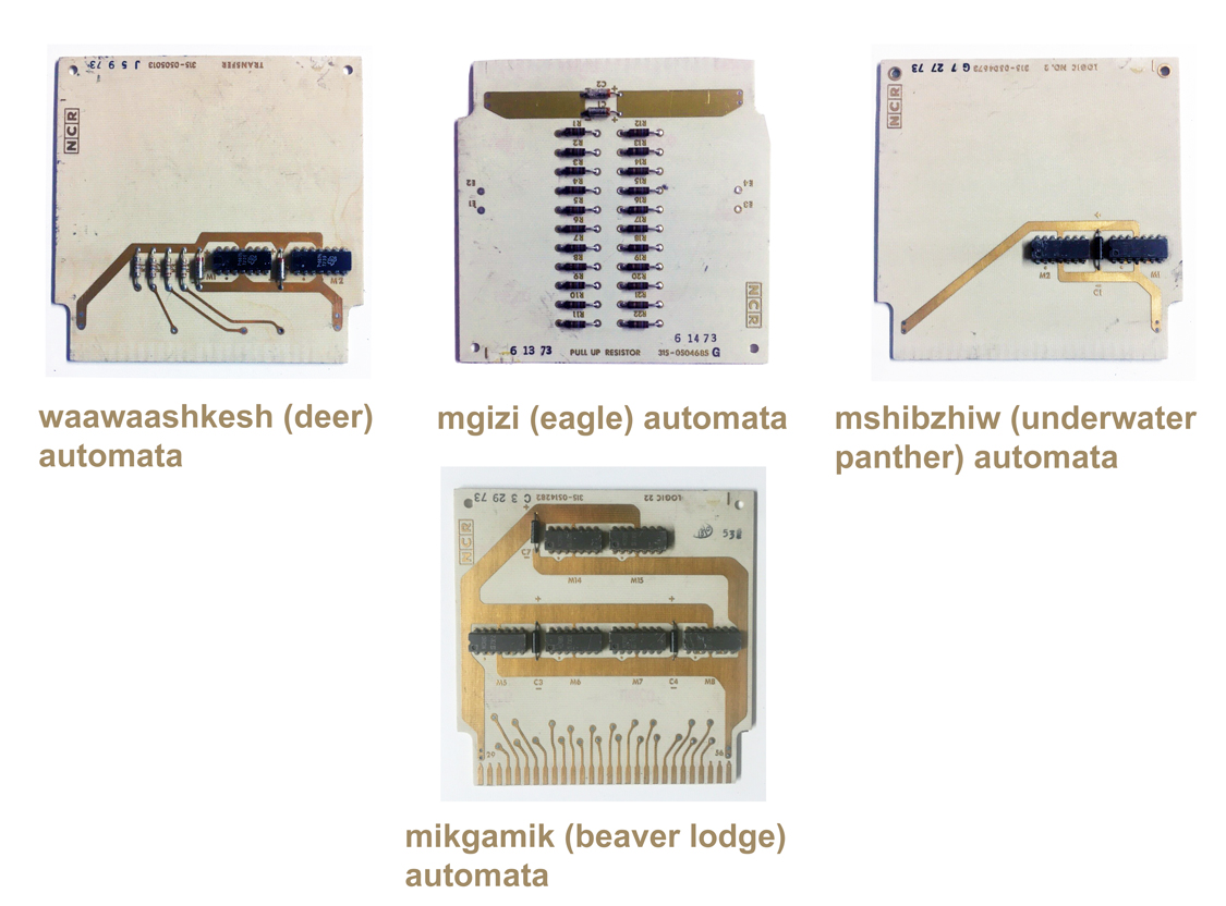 These electronic components, circuit-boards, wires, transistors, and relays are integrated into an automaton (plural automatons or automata) that control a device incorporating mechanical or electronic parts to follow a predetermined sequence of functions that are based on a predetermined set of instructions. A bank machine, a computer or a vending machine are examples. A correlation can also be drawn between mythology and mythological figures and automata in the sense that these mythological entities also perform a predetermined set of functions that are based on the instructions contained in myth and legend. For example, the mshibzhiw (underwater panther or great lynx) in Anishinaabe mythology is a being of the underworld that lives beneath the surface of the water and controls the waves and currents. By not following the coded protocols of respect for the water, as recounted in the stories, a predetermined adverse response will be triggered by the mshibzhiw and vice versa.