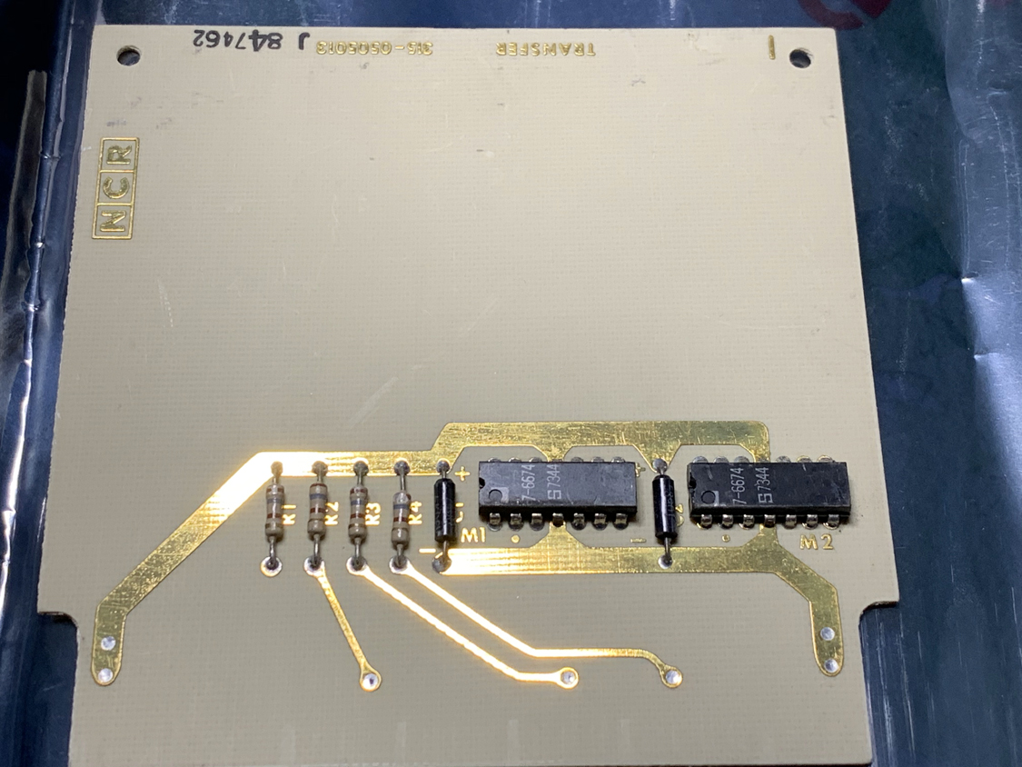 Detail of 1968 National Cash Register (NCR) Century 100 PC gold-plated transfer card circuit-board.