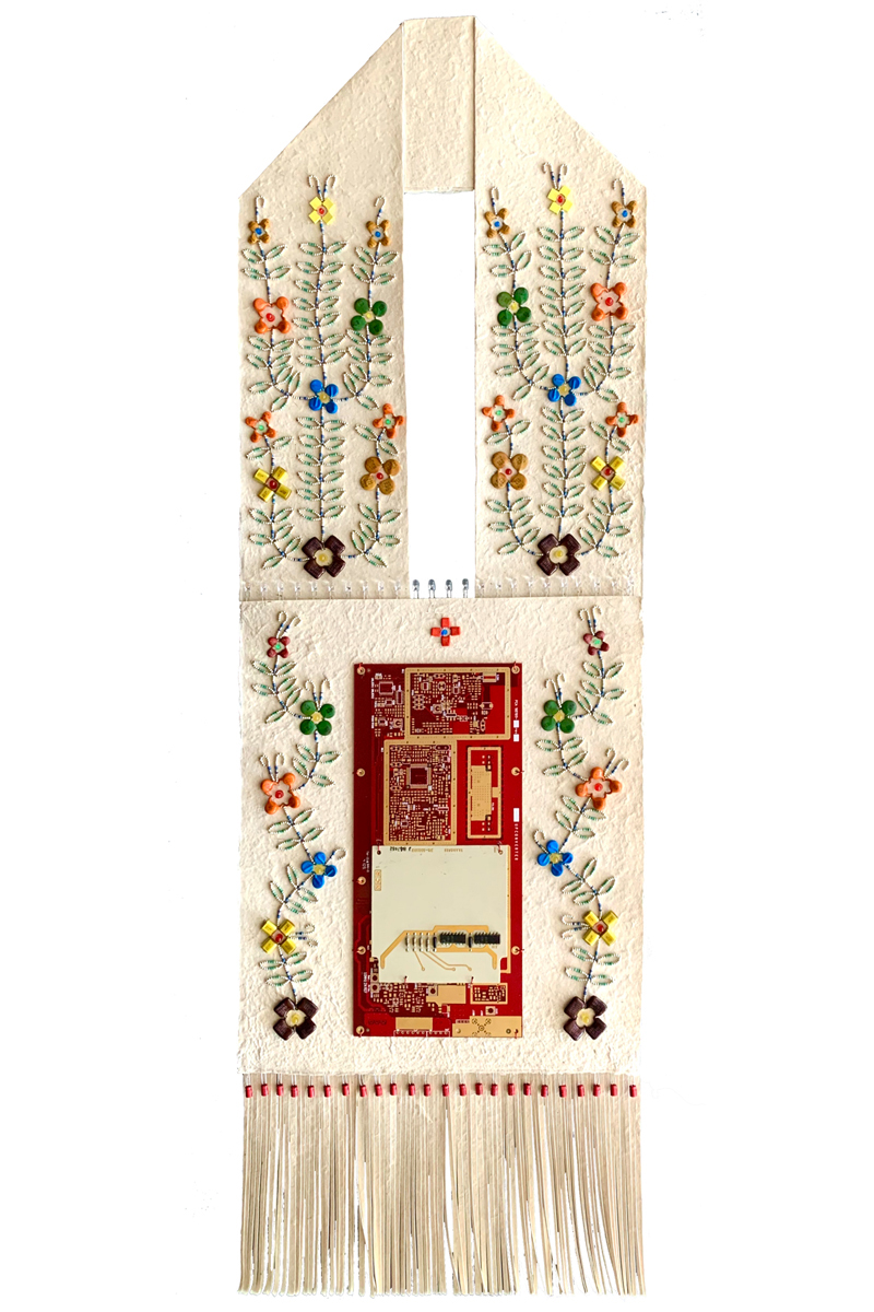 Waawaashkesh Dodem (Deer Clan) Automata Bandolier (2020) beads, electronic components, vintage circuit boards on handmade paper 96 x 31 cm. Private Collection (Toronto).