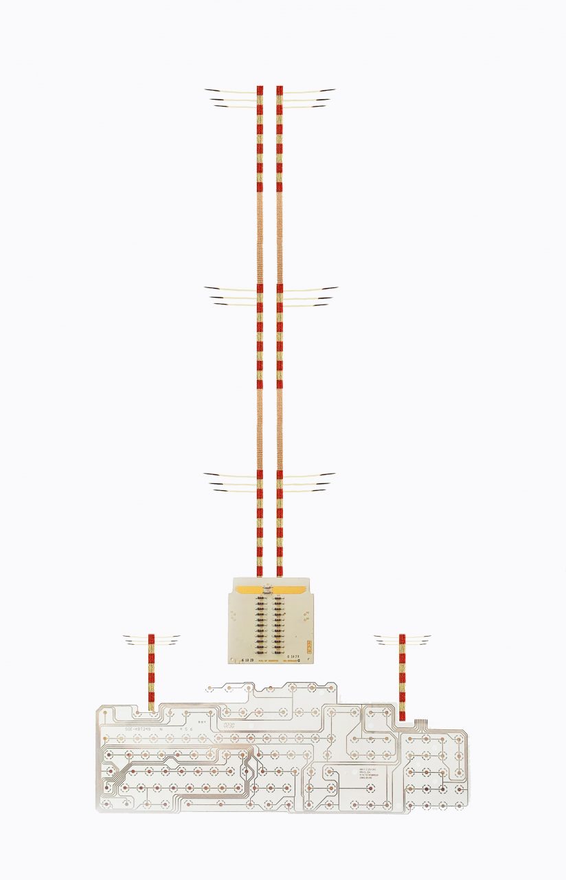 Flight of the mgizwak (eagles) Automata (2021) vintage circuit-board, beads, porcupine quills, acetate computer keyboard template on paper 101 x 67 cm. Available for purchase at Heffel Galleries.