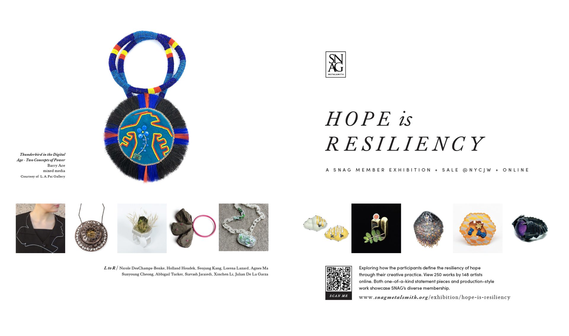 This year, the exhibition Hope is Resiliency is a multi-faceted event and sale that seeks to highlight SNAG’s diverse membership to several audiences. Submissions were considered for three main components: an in-person exhibition at New York City Jewelry Week (NYCJW); inclusion in Metalsmith magazine, Vol 42 No 3 (November); and an online exhibition. Selections were made by jurors Angelik Vizcarrondo-Laboy & Nora McCarthy for the in-person exhibition and magazine.