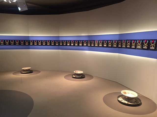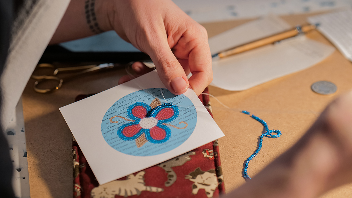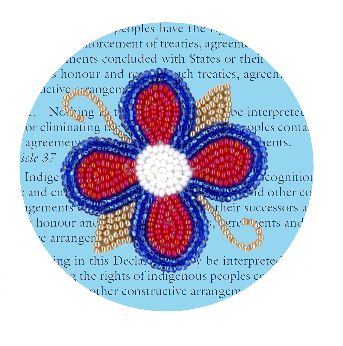 In Windsor, Ontario, Ace worked with 94 law students, art students, Indigenous and non-Indigenous participants who completed For as long as the sun shines, grass grows and water flows over a 4 day period, making 54 mixed media beaded panels with 94 handwritten calls to action scrolls mounted together in a continuous horizontal row set against a larger painted blue strip, referencing a wampum belt. For waawiindmawaa – promise (to promise something to somebody), 46 international law students, artists and general public (23 in Zurich and 23 in Geneva) hand-beaded a floral motif on a circular medallion, wrote one of the 46 UNDRIP articles in graphite on a vellum sheet that was rolled into a scroll and affixed to the medallion with tobacco. These medallions were placed inside one of the three honouring floor vessels. At the start of all workshops, each participant confirmed their participation by, first, surrendering their rights to the collaborative work by signing a witnessed document and then symbolically accepting one Canadian Dollar or Swiss Franc in exchange for the extinguishment of their rights to the works. This surrender was a wry reference to the treaty-making process in Canada.
