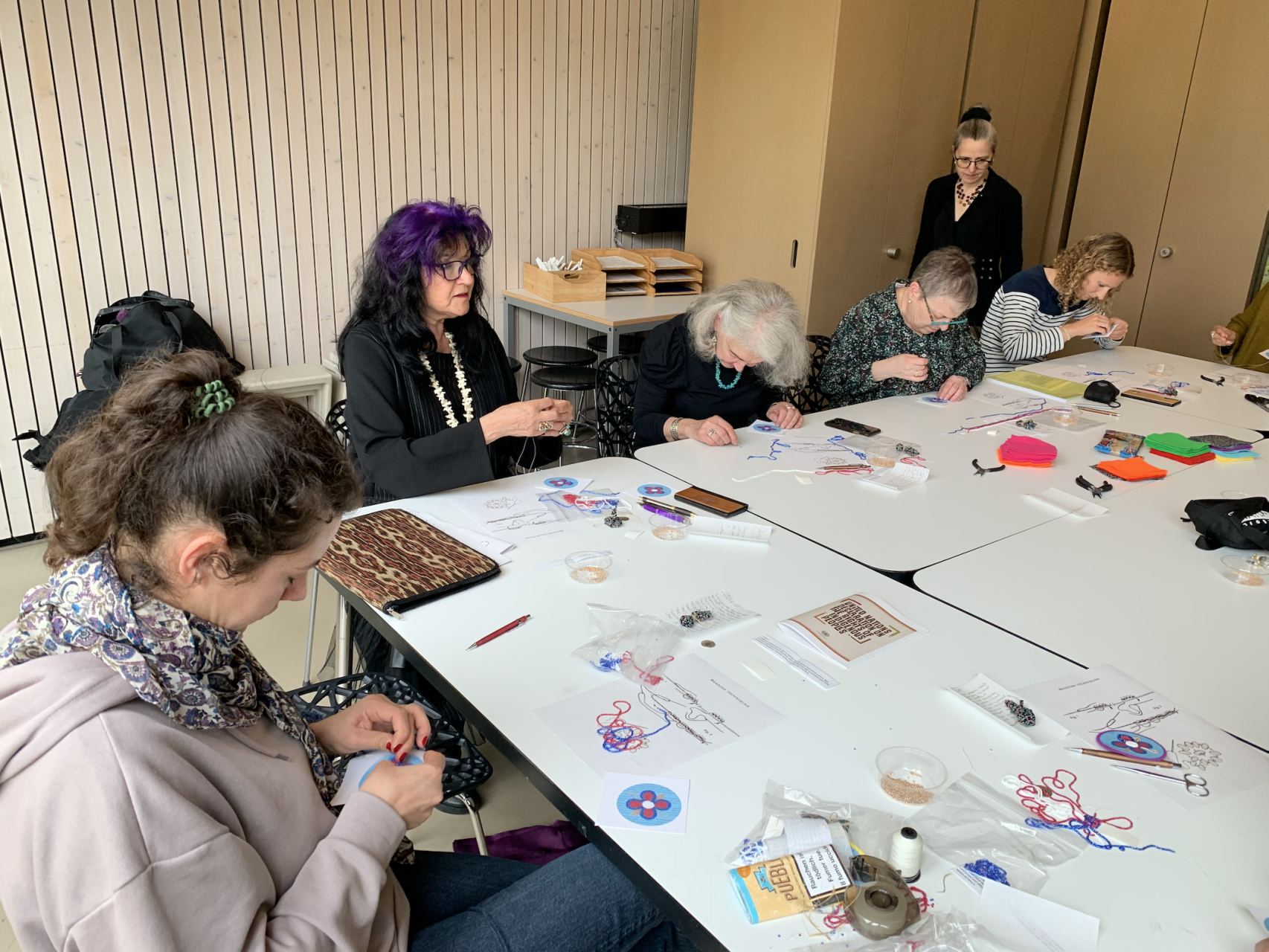 waawiindmawaa – promise (to promise something to somebody) workshop participants working on medallions and reading UNDRIP Articles (NONAM, Zurich). April 23, 2022.