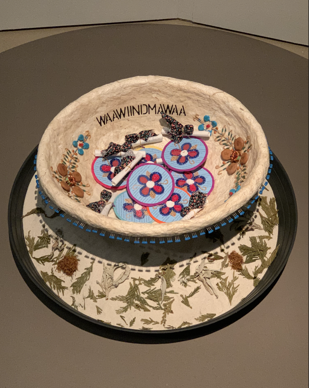 waawiindmawaa – promise (to promise something to somebody) (2022) #24 of 46 collaborative beaded UNDRIP Articles placed in each vessel with vellum scroll and tobacco tie.