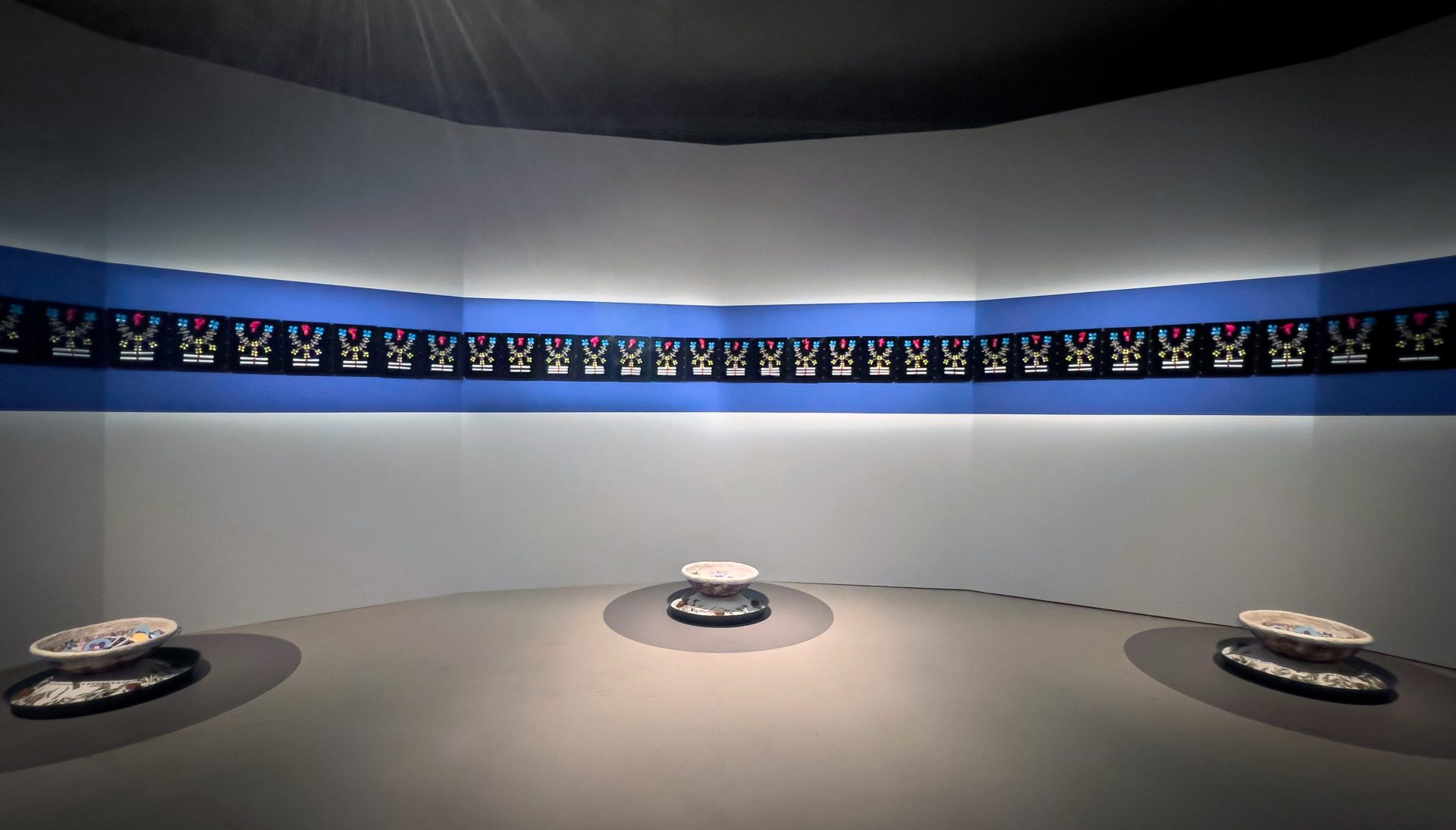 The work waawiindmawaa – promise (to promise something to somebody) (2022) consists of three floor pottery vessels containing 46 beaded circular medallions affixed to vellum scrolls. The vessels rest on top of three mounds of sand mixed with cedar, sage and tobacco. Evenly spaced apart, each vessel is positioned directly below and in dialogue with the wall mounted work For as long as the sun shines, grass grows and water flows (2018), an 11.5 metre wampum belt with beaded black velvet floral decorated panels, vellum scrolls and tobacco pouches.