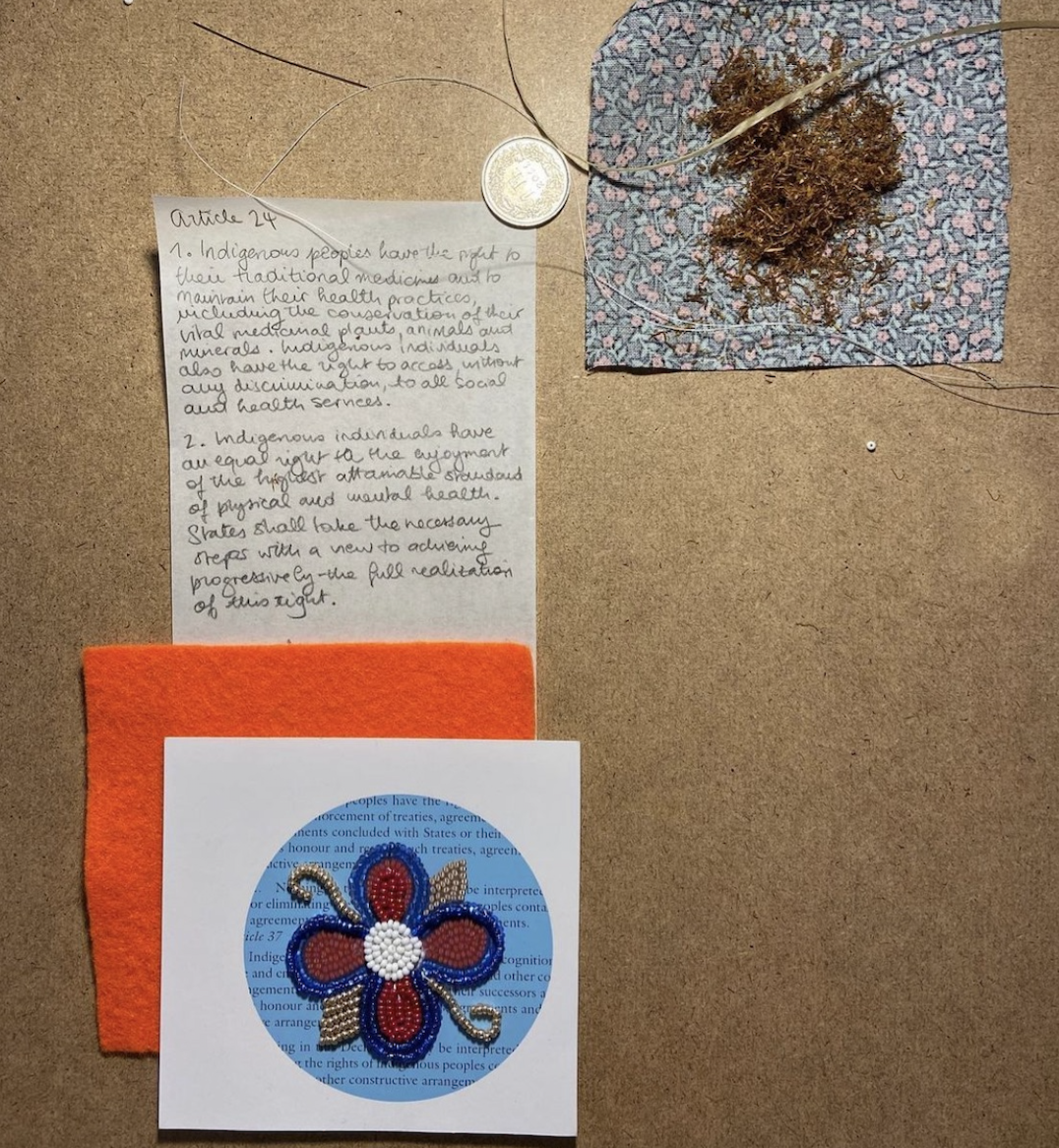 waawiindmawaa – promise (to promise something to somebody) workshop participants working on medallions and UNDRIP Articles (MEG, Geneva). April 28, 2022