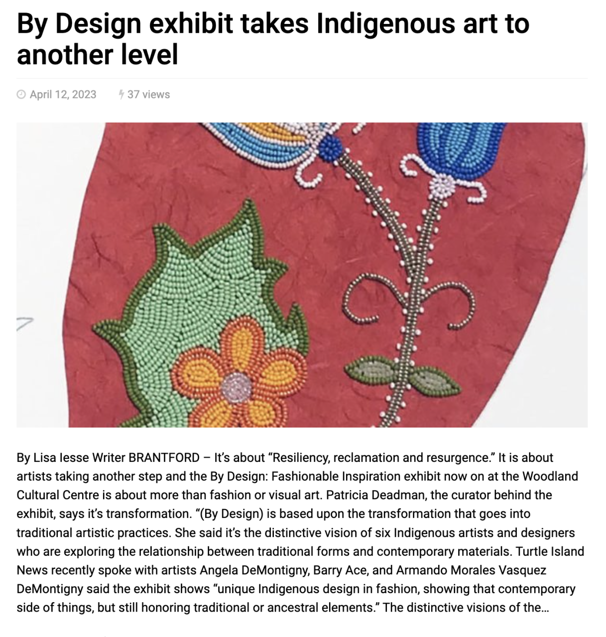 By Design: Fashionable Inspiration opens at the Woodland Cultural Centre, Brantford, Ontario. The exhibition is in the Tom Hill Gallery from February 18 to April 15, 2023.