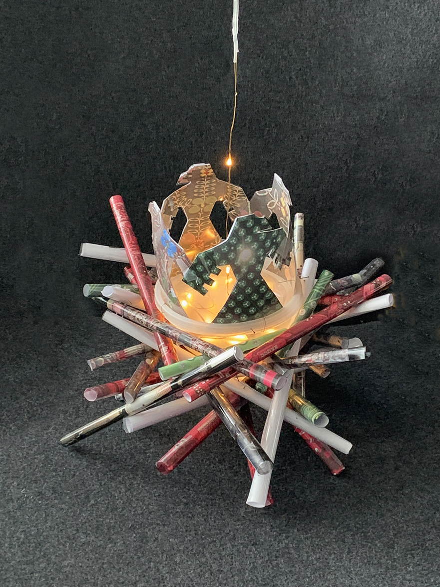 Maquette for Zasaan (Nest) (2023) Mixed media (plastic, paper, lights, metal) 8 x 13 x 13 inches , 20.32 x 33.02 x 33.02 cm.