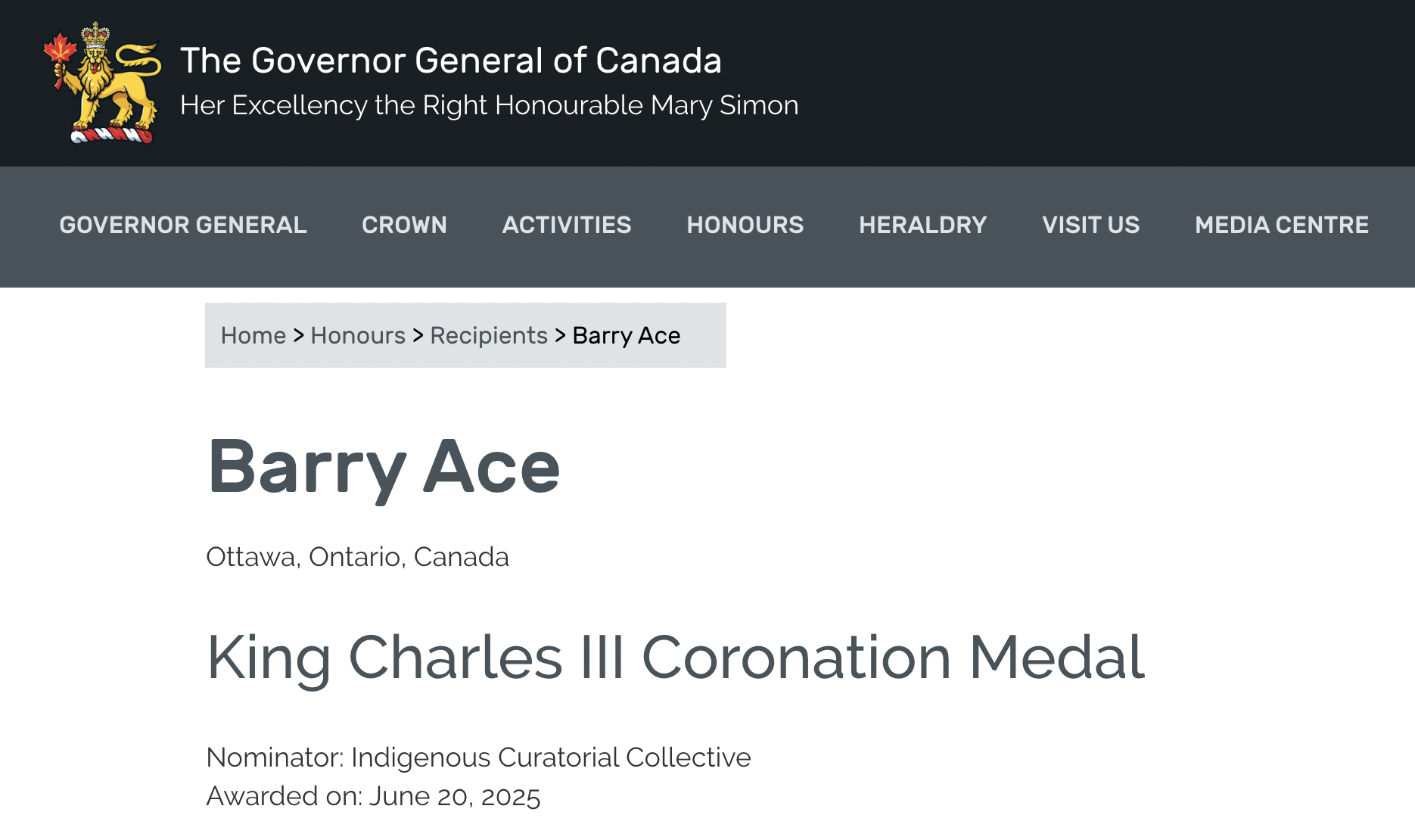 As a nominating partner to the Governor General’s office, the Indigenous Curatorial Collective (ICCA) submitted 20 nominees for the King Charles III Coronation Medal. The ICCA state in their press release “we extend our heartfelt congratulations to the incredible recipients of the King Charles III Coronation Medal. Your dedication to Indigenous arts, culture, and community continues to inspire and create lasting impact across Canada and beyond. This recognition is a testament to your leadership, creativity, and commitment to cultural sovereignty. We celebrate your achievements and honour your contributions with gratitude and admiration.”