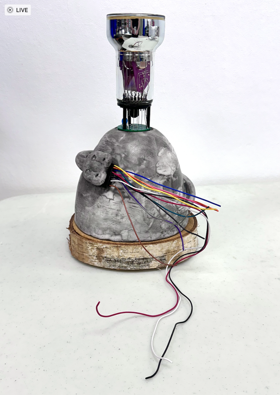 The Earth Remembers: Echoes of Light (2024) white clay (stone buffed and raku fired), circuit board, photomultiplier tube. 35 x 18 cm. Collection of the Artist.