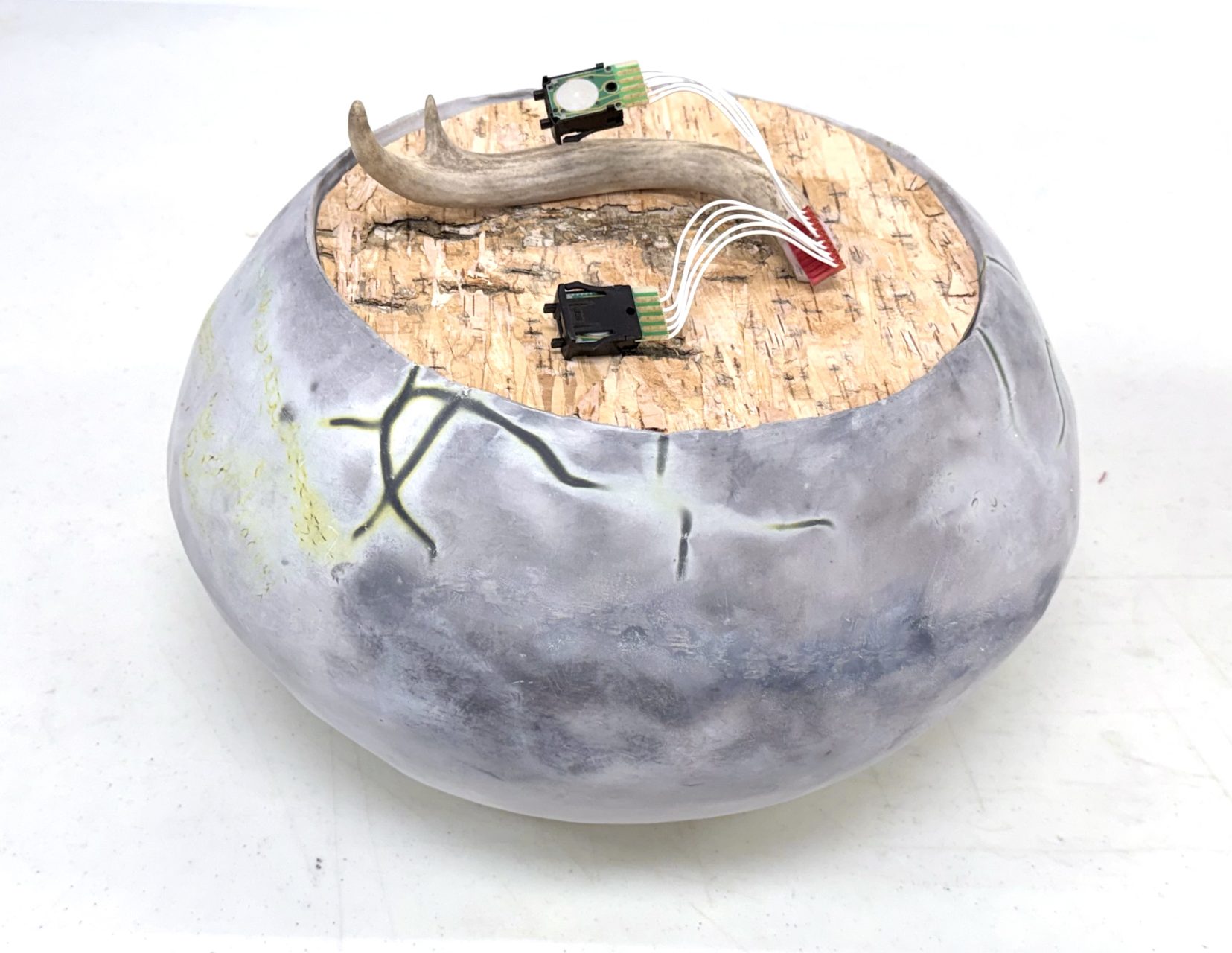 Reliquary of Bark, Bone, and Measured Time (2026) Pit fired clay vessel, birch bark, deer antler, electronic counter component 36 x 26 cm. Collection of the Artist.