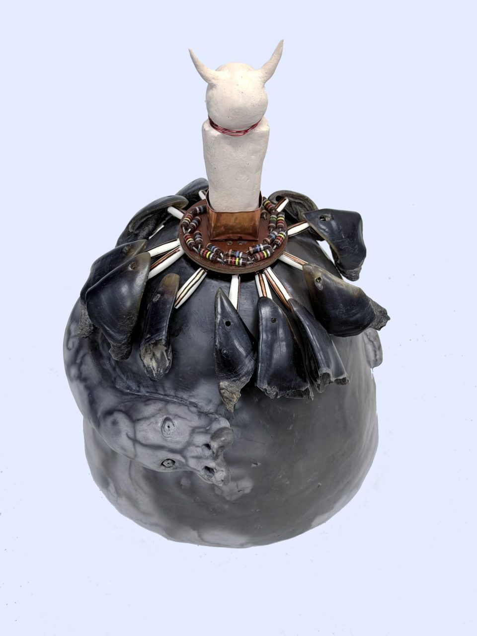 A Shaman’s Transformation: Before He Was, the Serpent Dreamed (2026) Raku fired clay (vessel), kiln fired clay (figure), copper, circuit board, resistors, anodized wire, deer dew claws, glass beads. 35 x 25 cm. Collection of the Artist.